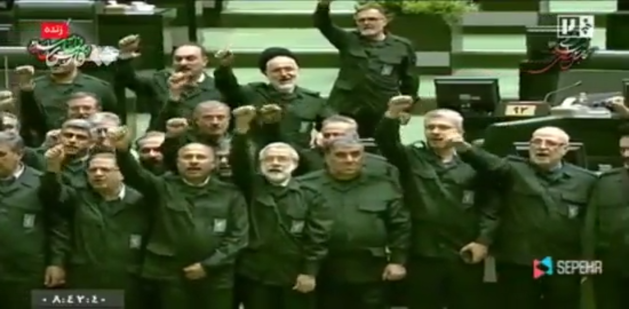 أبان مقطع فيديو نشرته وسائل إعلام إيرانية، ارتداء عدد من نواب البرلمان الإيراني زي الحرس الثوري، تحت قبة المجلس، مرددين هتافات مناهضة لأمريكا وإسرائيل.