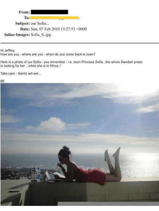 كما ورد ذكر الأميرة صوفيا في رسالة بريد إلكتروني أُرسلت إلى إبستين، حيث أُرفقت صورة قيل إنها لها. وجاء في الرسالة الموقعة بالأحرف الأولى (BE): "إليك صورة لصوفيا الخاصة بنا - هل تتذكر - أي الأميرة صوفيا عما قريب... الصحافة السويدية بأكملها تبحث عنها... بينما هي في أفريقيا".