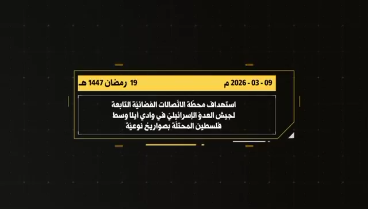 أعلن حزب الله اللبناني في بيان مساء الاثننين، استهداف محطة الاتصالات الفضائية التابعة لشعبة الاتصالات والدفاع السيبيري في الجيش الإسرائيلي بوادي إيلا بصلية من الصواريخ النوعية.