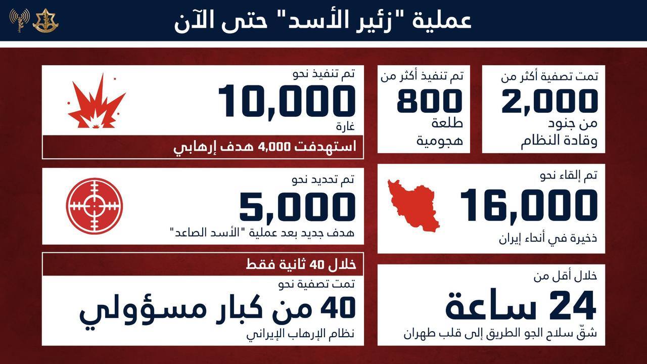 وجاء في بيان الجيش الإسرائيلي حول المعطيات التي تم تسجيلها حتى الآن في إطار الحرب التي تشنها إسرائيل على إيران: