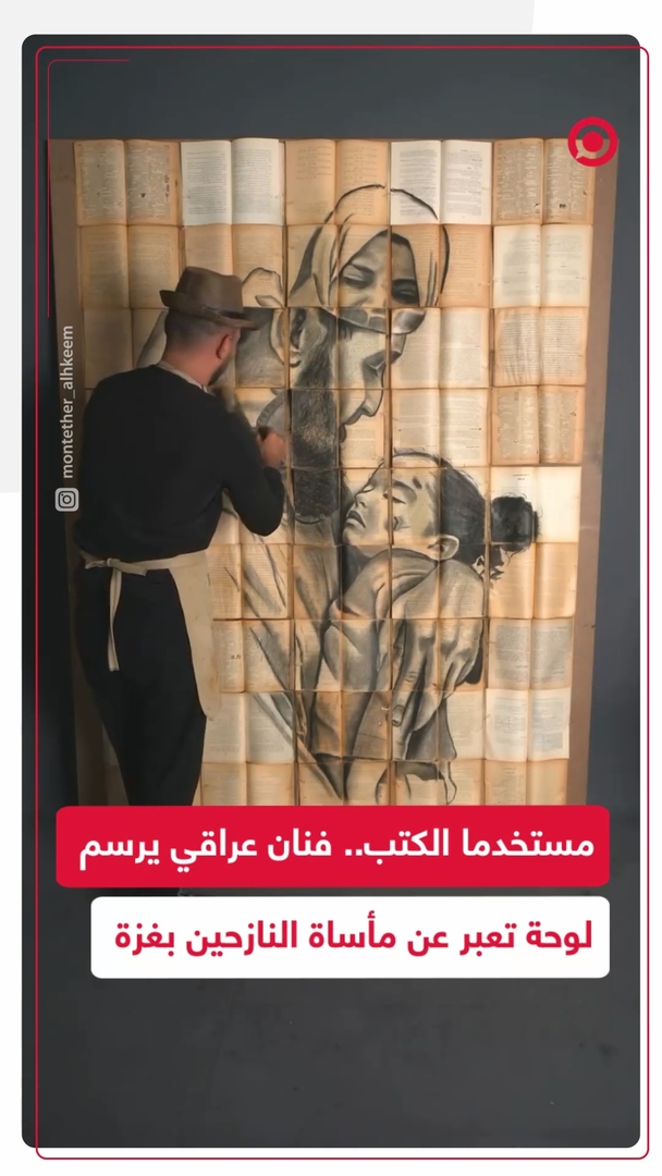 باستخدام الفحم وأوراق الكتب.. فنان عراقي يرسم لوحة تعبر عن مأساة نازحي غزة