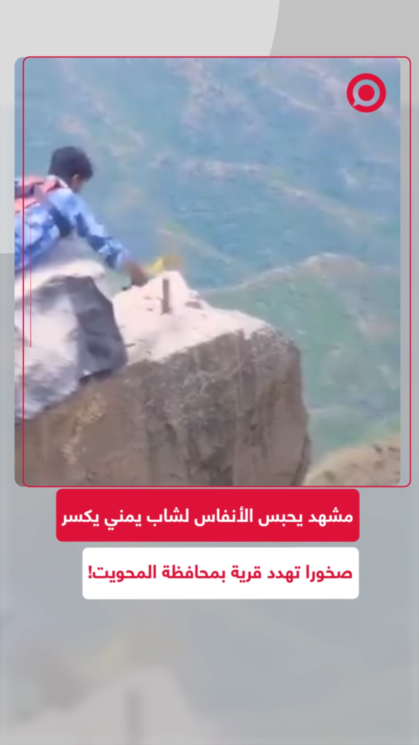 مشهد يحبس الأنفاس لشاب يمني يكسر صخورا من أعالي إحدى المرتفعات، حيث كانت تهدد أهالي قرية بيت البحري بمحافظة المحويت.