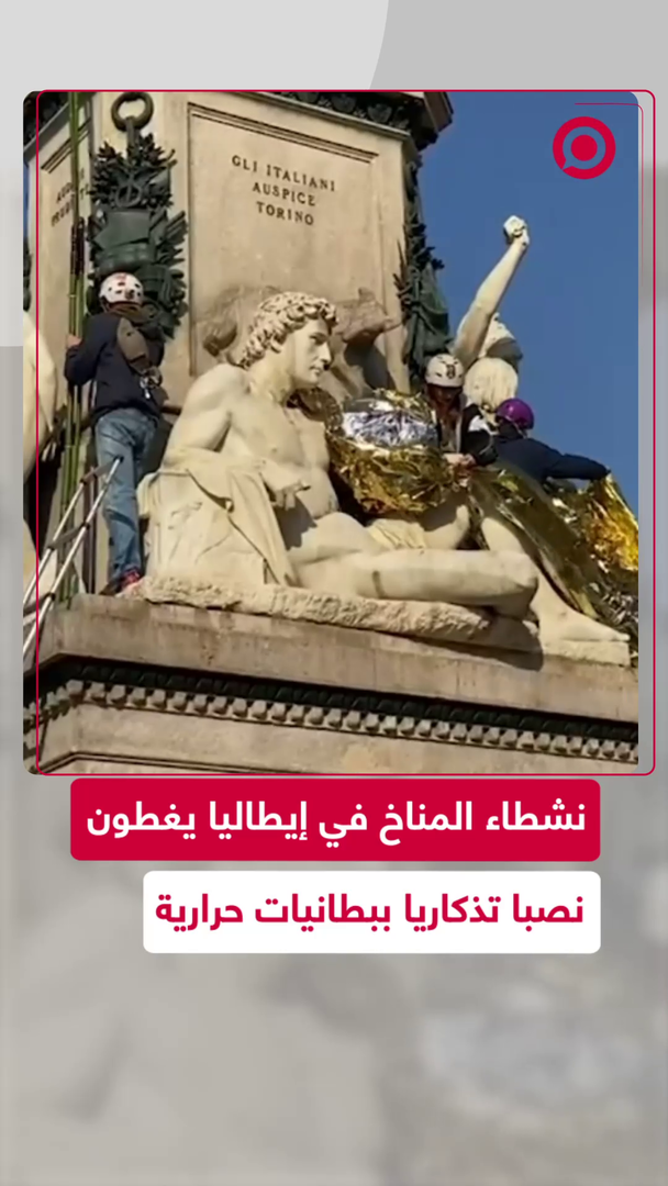 احتجاجا على استخدام الوقود الأحفوري والتغير المناخي.. نشطاء إيطاليون يغطون نصب الكونت كافور ببطانيات حرارية #ترند #فيديو #viral #اكسبلور #إيطاليا #التغير_المناخي