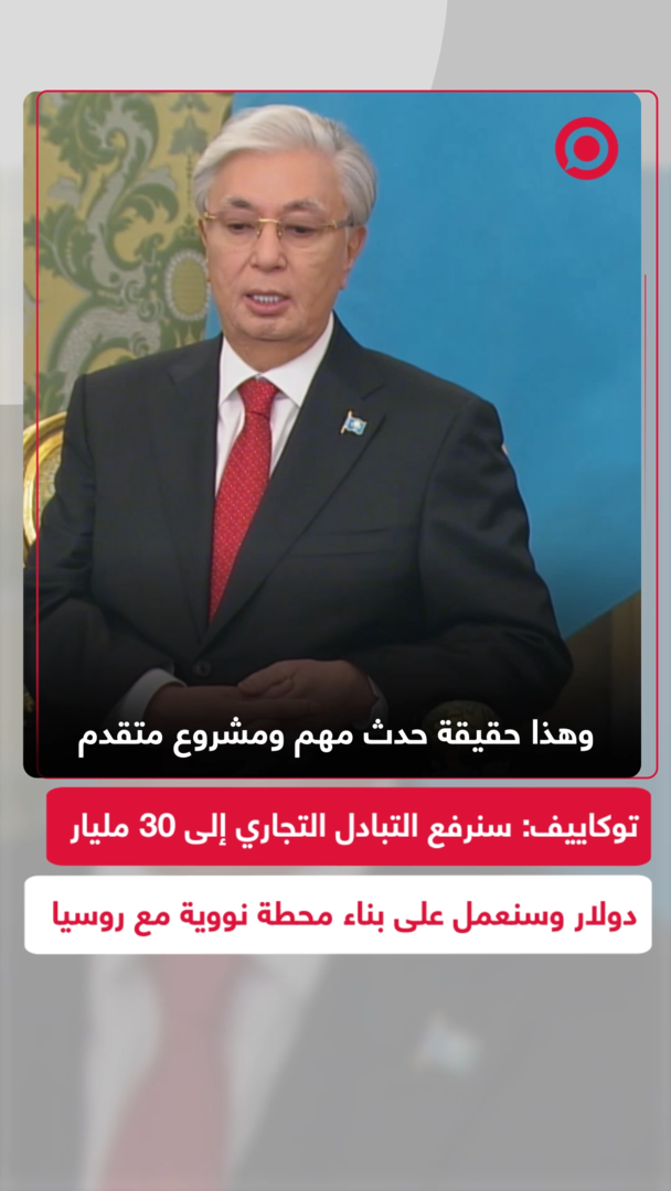 توكاييف: سنرفع التبادل التجاري إلى 30 مليار دولار وسنعمل على بناء محطة نووية مع روسيا
