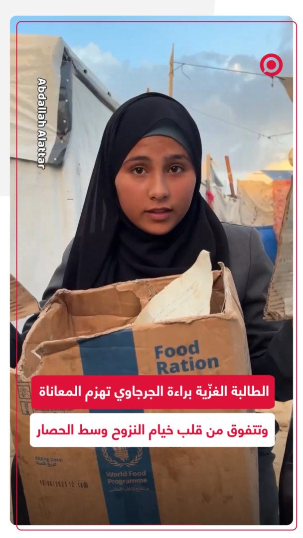 في خيمة لا تقي من برد الشتاء ولا مطرهِ، وباستخدام كراتين المساعدات كبديل للدفاتر، استطاعت براءة حسام الجرجاوي - الطالبة الحافظة للقرآن الكريم - أن تتحدى ظروف النزوح القاسية، ولم تمنعها قسوة الحياة ولا عجز والدها عن توفير مستلزمات الدراسة من المثابرة، لتحقق أخيراً نسبة 97.9% في شهادة الثانوية العامة، وترسم بألمها وإصرارها أجمل قصص النجاح والتحدي. #تفوق #كراتين #الفقر